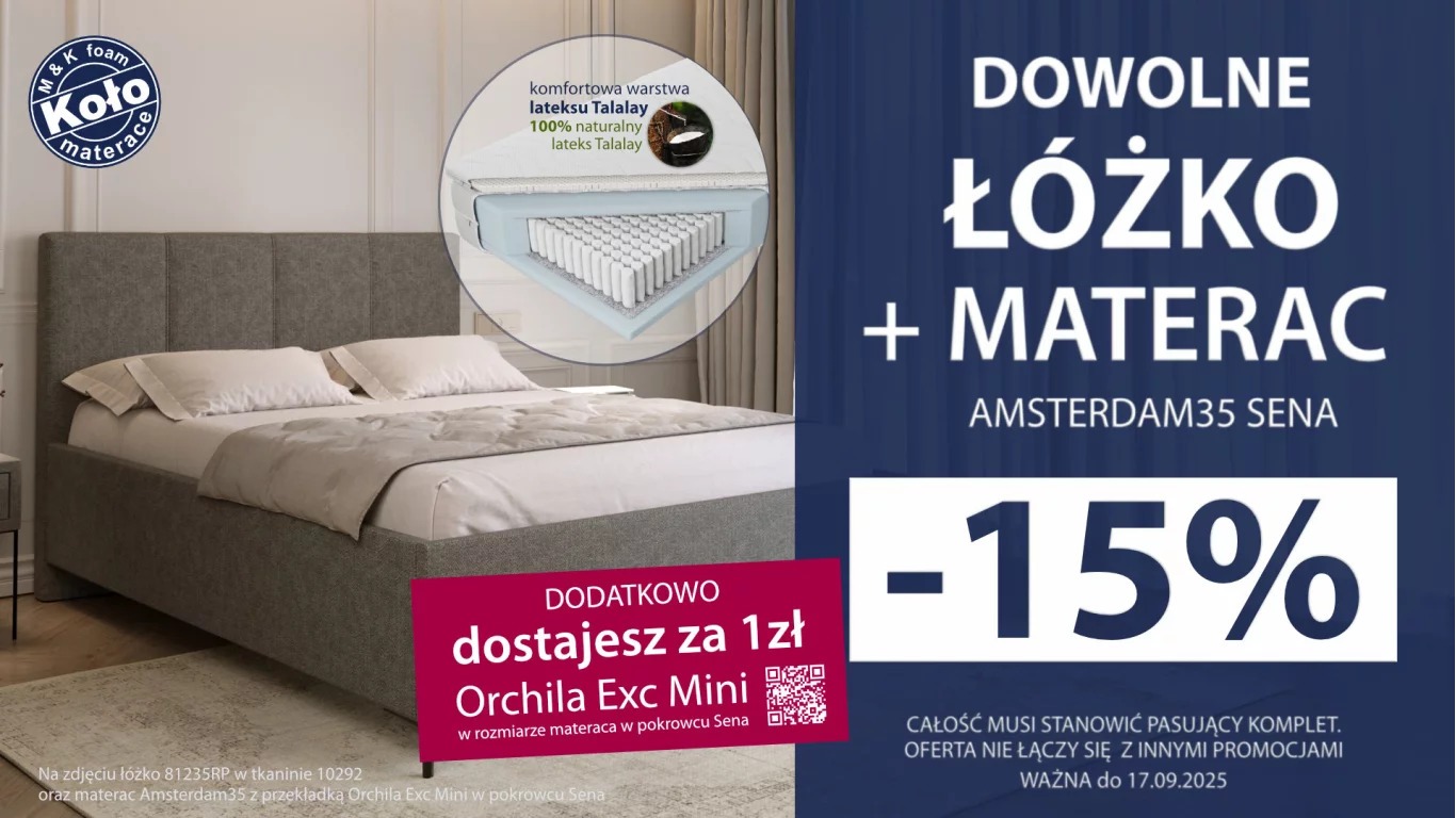 PROMOCJA OtoMaterace✨ Śpij w komforcie i oszczędzaj! ✨ Wybierz dowolne łóżko + materac Amsterdam35 Sena i skorzystaj z rabatu -15% 🛏️ A dodatkowo za jedyne 1 zł otrzymasz przekładkę Orchila Exc Mini w rozmiarze materaca 💎 Sklepy biorące udział OTO MATERACE